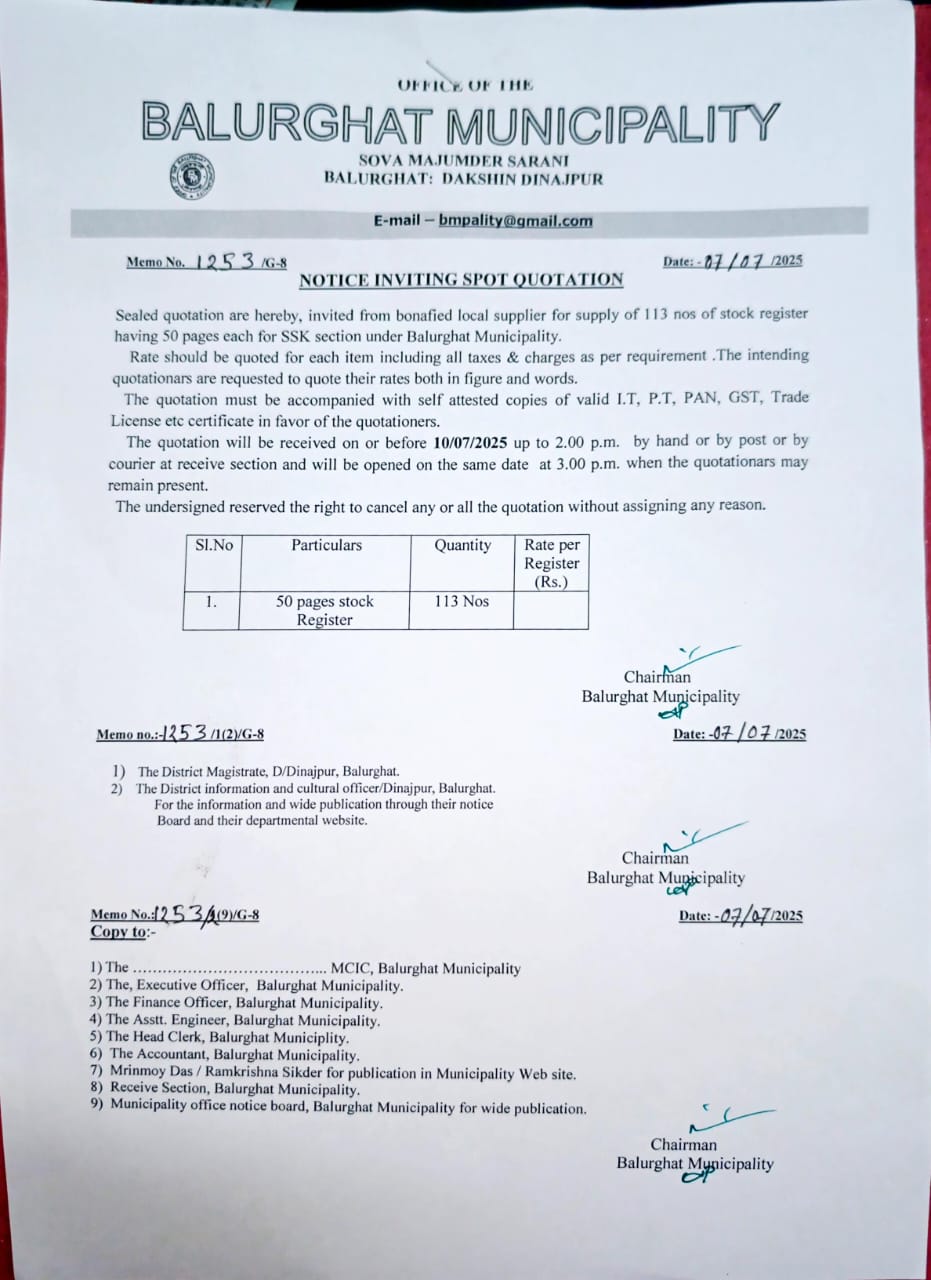 NISQ for Supplying of 113 Nos,. 50 Pages Stock Register for SSK Section under Balurghat Municipality.