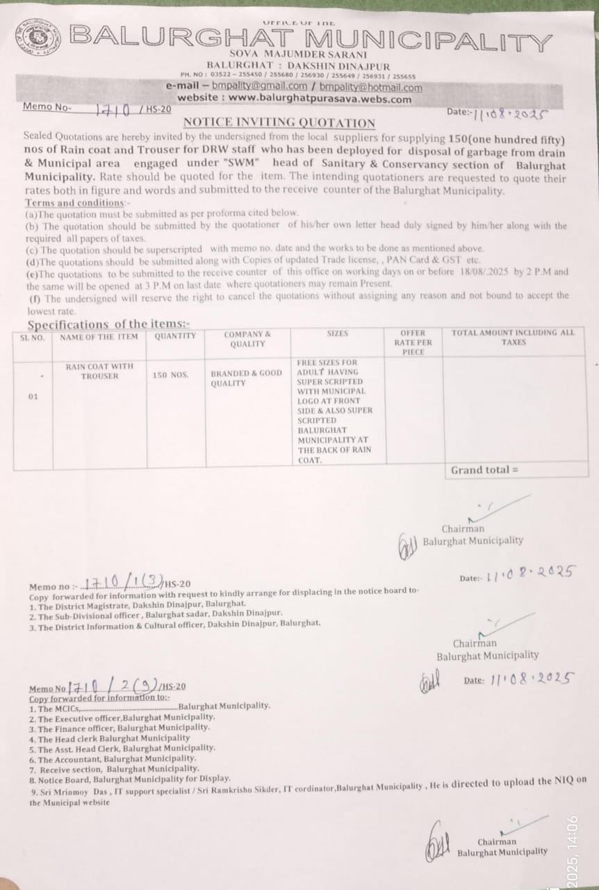 NIQ for Supply of 150 nos. Rain Coat under Balurghat Municipality Memo No. 2232/HS-20 Dt. 11.09.2024